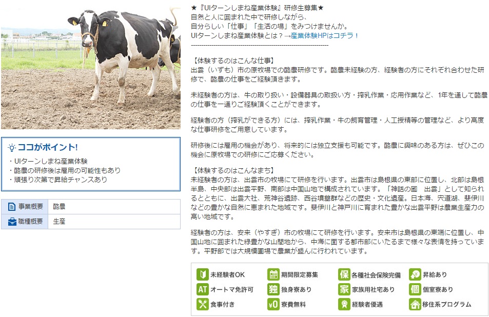 今回は島根の産業体験事業を書いて比較していきたいと思います。これも助成金を使っての事業です。給料が体験しながらにもらえるという素晴らしいものか!?とか思ってみましたが、やはり体験という響きというよりはトライアル雇用というニュアンスの方があっています。