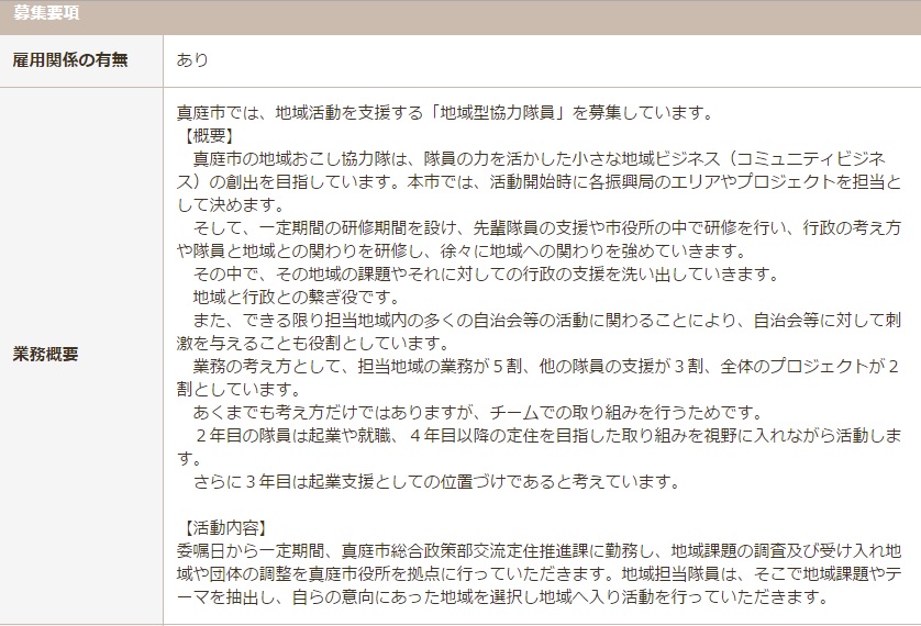 地域の行事などをこなしつつ三年後からは事業を地域に根差した起業をするということを前提とした募集です。