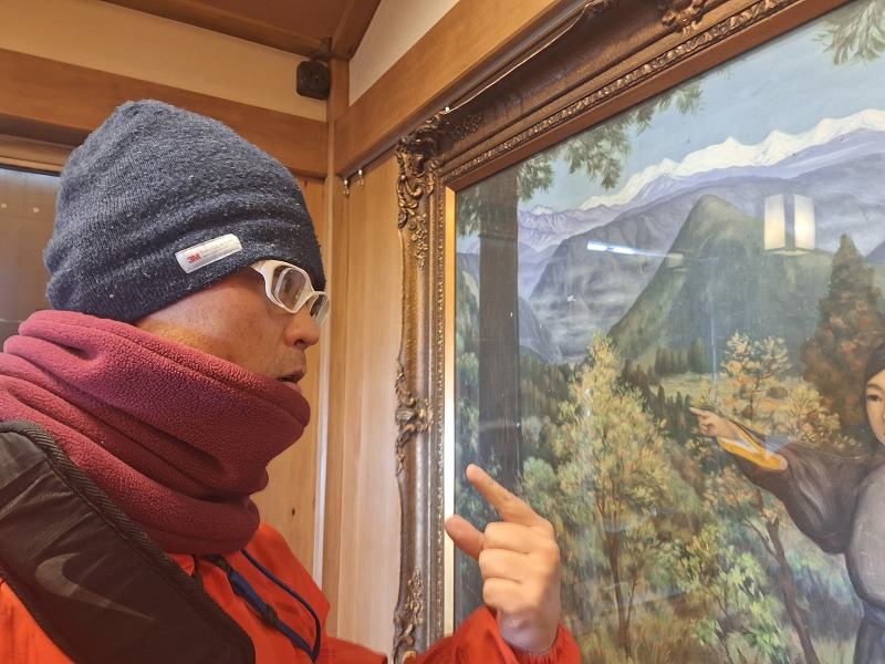 を突き当りに歩くと簡易郵便局がありそこを上ると雄山神社のレプリカがある展示室に行きます。