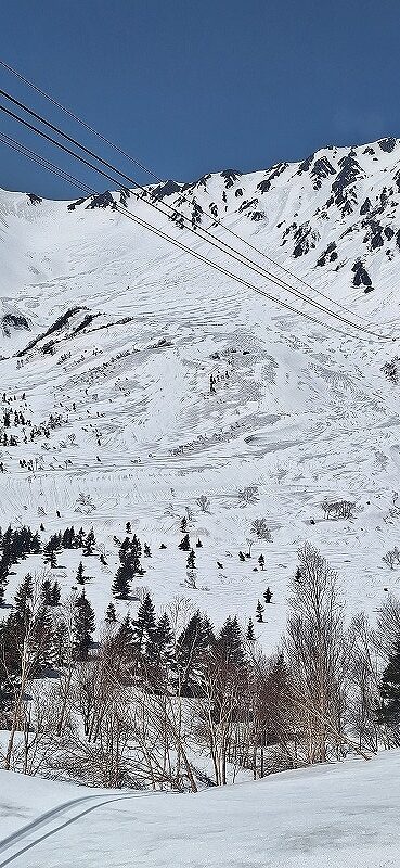 斜面を雪玉が転がってこういう斜面になります。このころはまだ積雪があり、いたるところに滑走痕がありました。ここにもバックカントリーのルートがあるようです。ただ、岩がかなり大きいものがあるんです。それらを踏まずに滑ることができる積雪量を見誤らない力量や慣れも必要ですね。