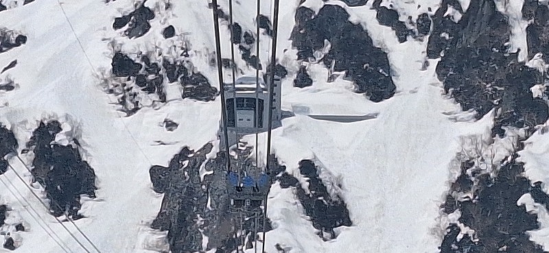 なので雪もかなり多く残っていました。そしてロープウェイで下ると、木々の間に人がいるんですね。