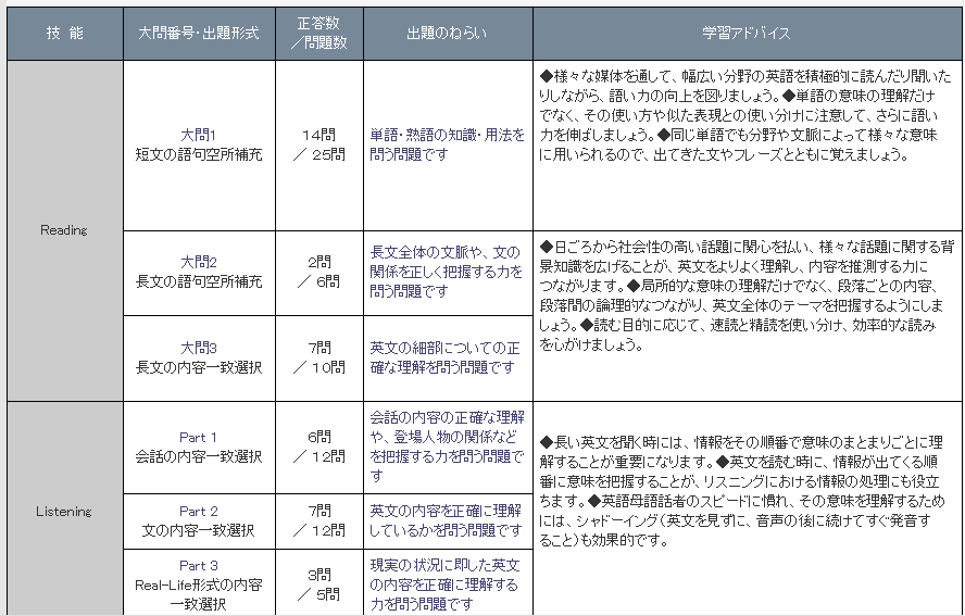 やはり全体的にぼんやりわかってないっていうことが見えてきます。そのなかでここまでできたのは善戦でした。リスニングの3番は結構正答率は高いので問題はやはり前半の単語の穴埋め、長文読解の穴埋めと空所補充です。バシっとここらへんを理解しておかないと上に行けそうにないです
