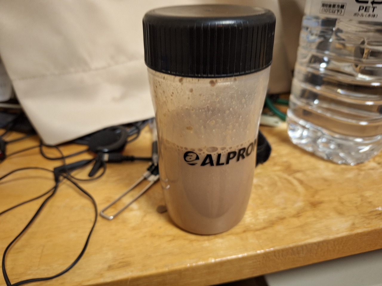 ドンキの3キロのプロテインです。これがおいしいし腹持ちがものすごくいい。これを朝夕の飯にする。それと朝は買いだめした春雨とみそ汁を飲んでいます。