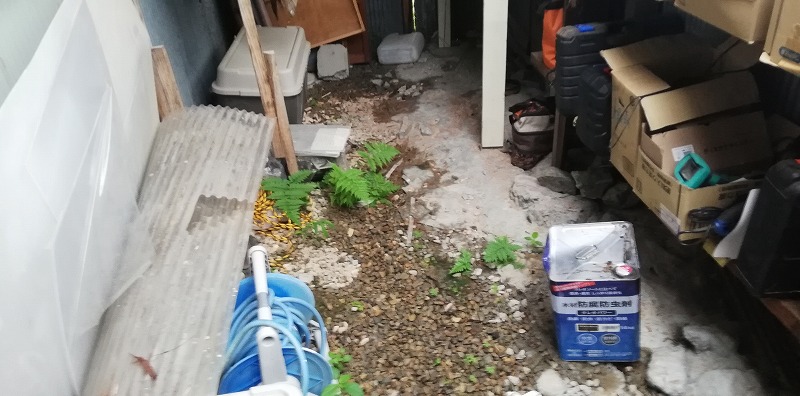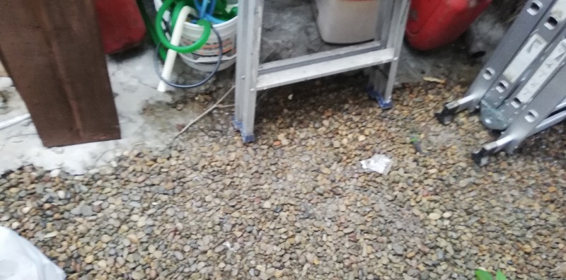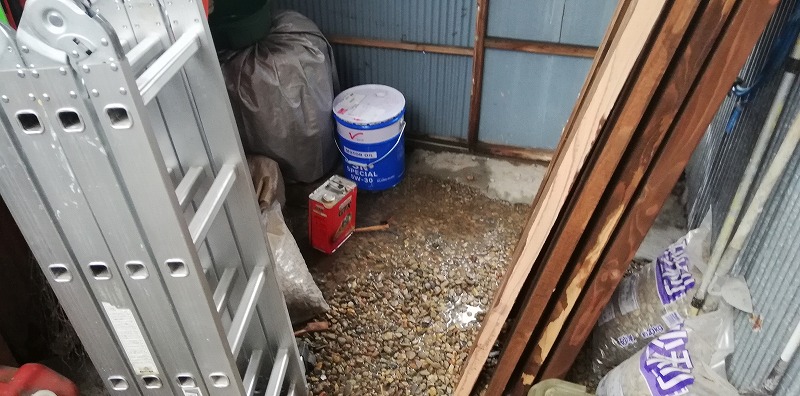 写真は納屋です。結構な雨が降り続いていたので心配ではありましたが、やはり納屋では水が地面から湧いていました。水が地面からはけないので敷いた砂利が水で濡れていますね。