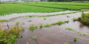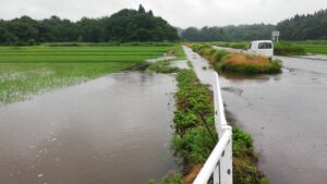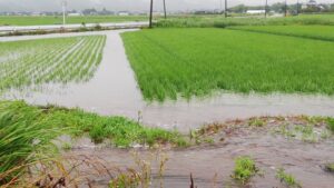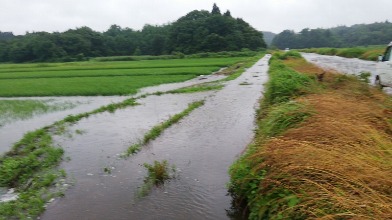正解は用水路があふれて水田が水浸しになっていたんです。正直普段の時の水嵩って全然番うんですよ。こんなにあふれるなんて言うことはまずないです。水路のコンクリが全く見えないなんて言うことはないです。