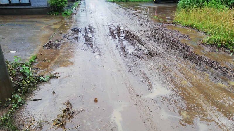 もう敷いた砂利がいったん使った跡があるので結構な水がわいてきていました。この雨量は2021年のお盆、隣の製材所が水であふれて玄関のところまで少し水が来た時くらいに匹敵します。少し非難をするかを考えましたね。まだ避難指示は出ていませんでしたが、基本この高崎地区は一番土地が高く、非難をしたほうが途中の冠水した道路を通らねばならず、避難所に行く途中がむしろ危ないので非難をしません。避難所よりも安全です(笑)