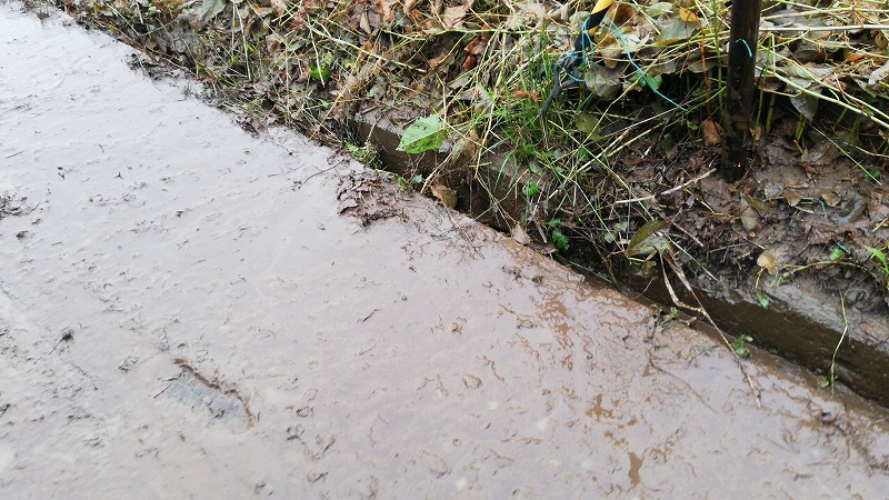 いつもは底が見える側溝。でも泥がかなり入っていて埋まってしまいそう・・・