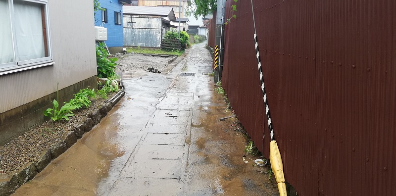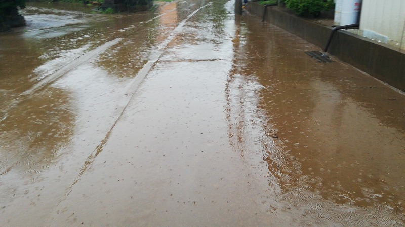 反対側の家です。すでに水がコンクリートの堤防を乗り越えて入ってきてしまっています。ちなみに10センチないくらいまで川の水は嵩が上がっていました。