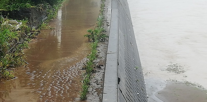 馬場目川沿いのお寺の塀。水圧に耐えきれずに中がばっこり倒れてなくなっています。