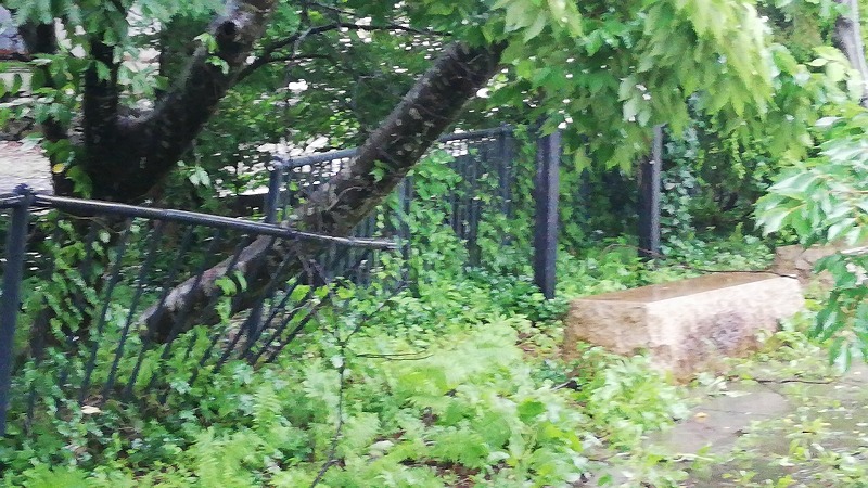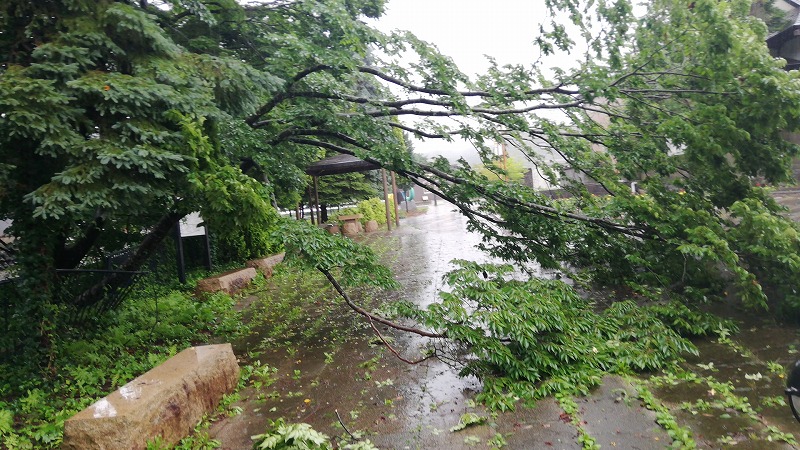 水圧で街路樹?が倒れて策を押し倒しています。