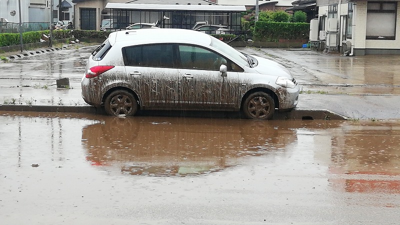 冠水道路を走っていて道路と路肩の区別がつかずに乗り上げたんでしょうか?水の高さを物語っています。