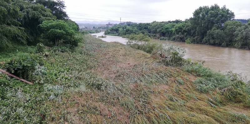 これは今回の大雨で氾濫した馬場目川。正直いつもの5倍は軽く水位が増えていてここまで水面が迫っているのは見たことがないです。しかも橋桁の高さは10メートルはあるんですよ?その高さが埋まるくらいの雨量ということなので言葉言い表すことができないレベルの雨量です。