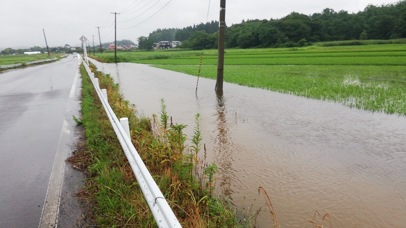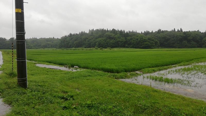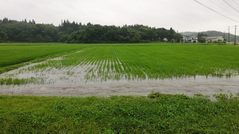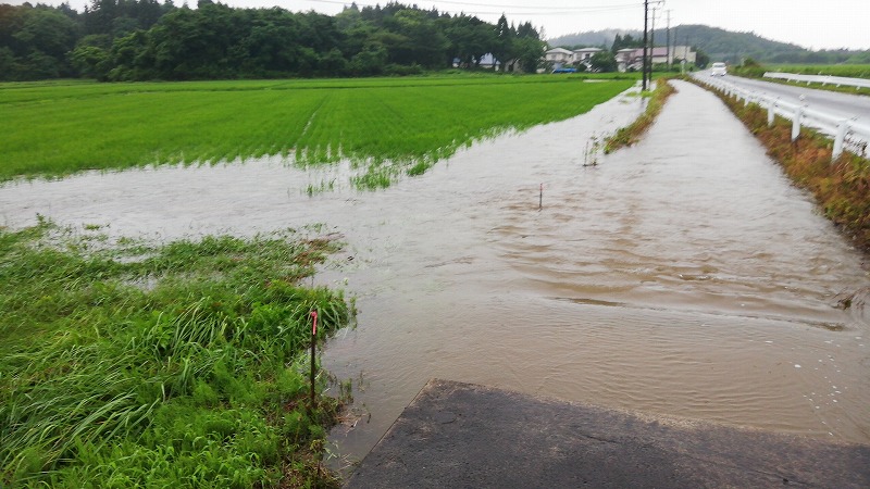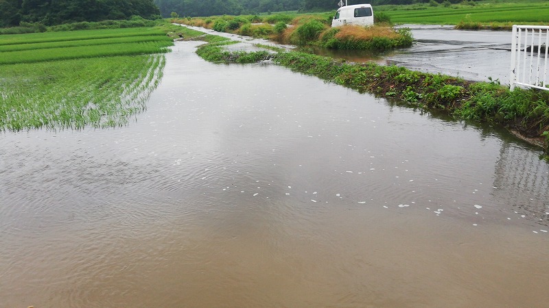 正解は用水路があふれて水田が水浸しになっていたんです。正直普段の時の水嵩って全然番うんですよ。こんなにあふれるなんて言うことはまずないです。水路のコンクリが全く見えないなんて言うことはないです。