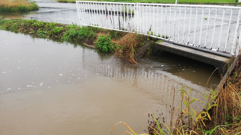 反対側の水田を見ても水嵩の高さは一目瞭然。稲が頭まで使ってしまっています。ただ、水田に水が入ってるのでこっちの水嵩もおかしいです。水を排出できずに水が溜まっていっています。