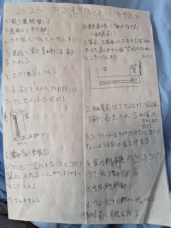 - 家前、工場側に土を盛る。駐車場真ん中(下水管を出さない)を掘り進み水を掘り、砂を入れる