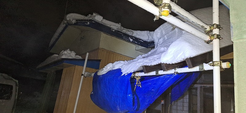 この渡り廊下の入り組んだところの雪を下ろさないと軒が折れます。家の中から何本かは見ていますが、結構折れてはいます。前の売主が雪下ろしまではしていなかったんでしょうね。空気の入れ替えはしていましたが。ここは結構ダメージがあり、ケイカル板も折れています。
